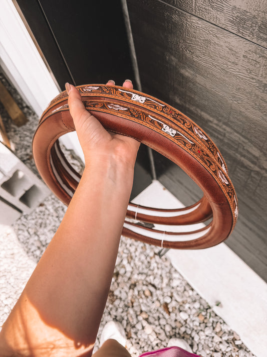 Longhorn Tooled Leather Steering Wheel Cover in Brown 14 inch