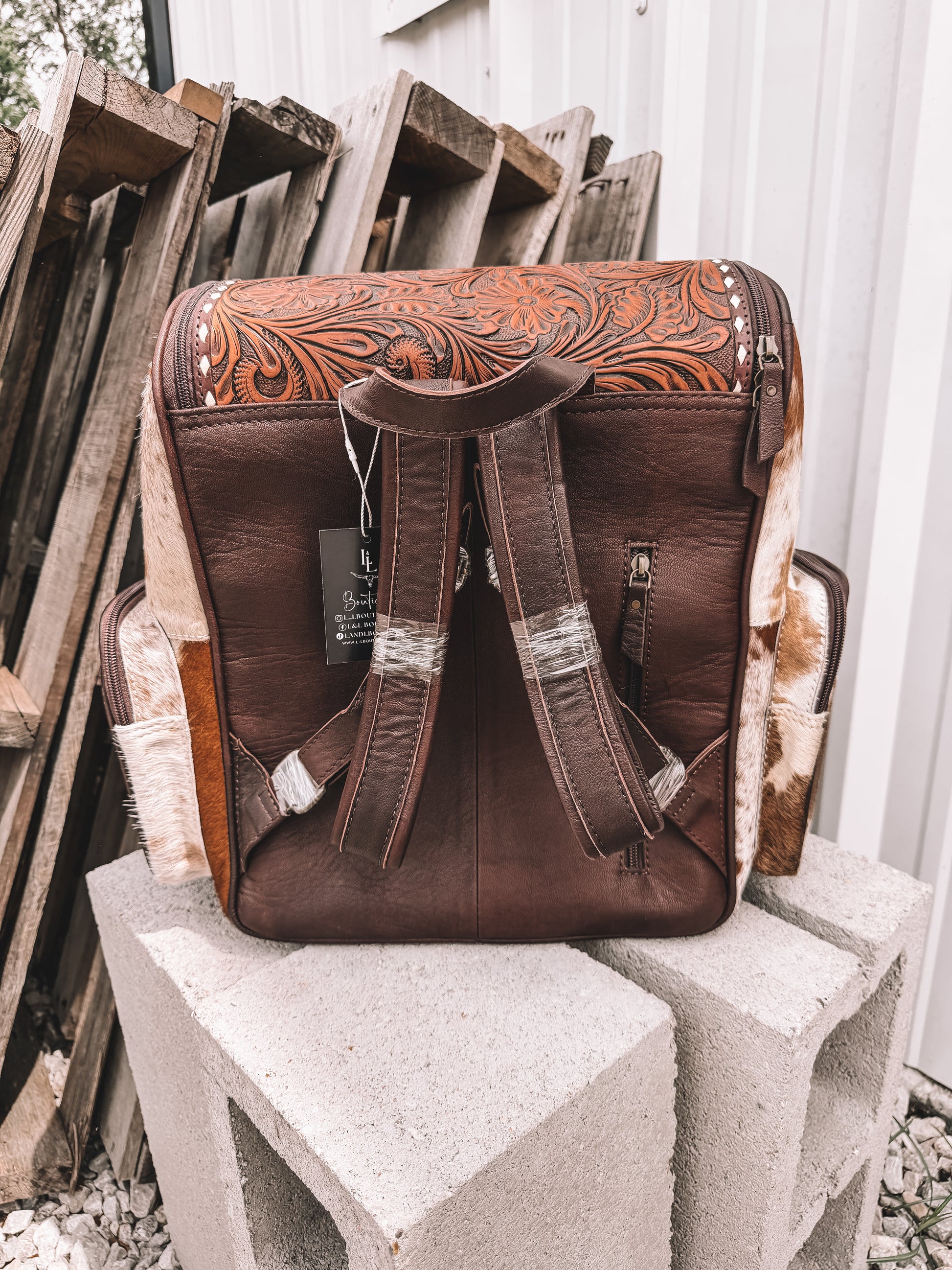 16x14x7” with pockets on the inside and outside. Concealed carry pocket. Adjustable leather straps. Hides vary
