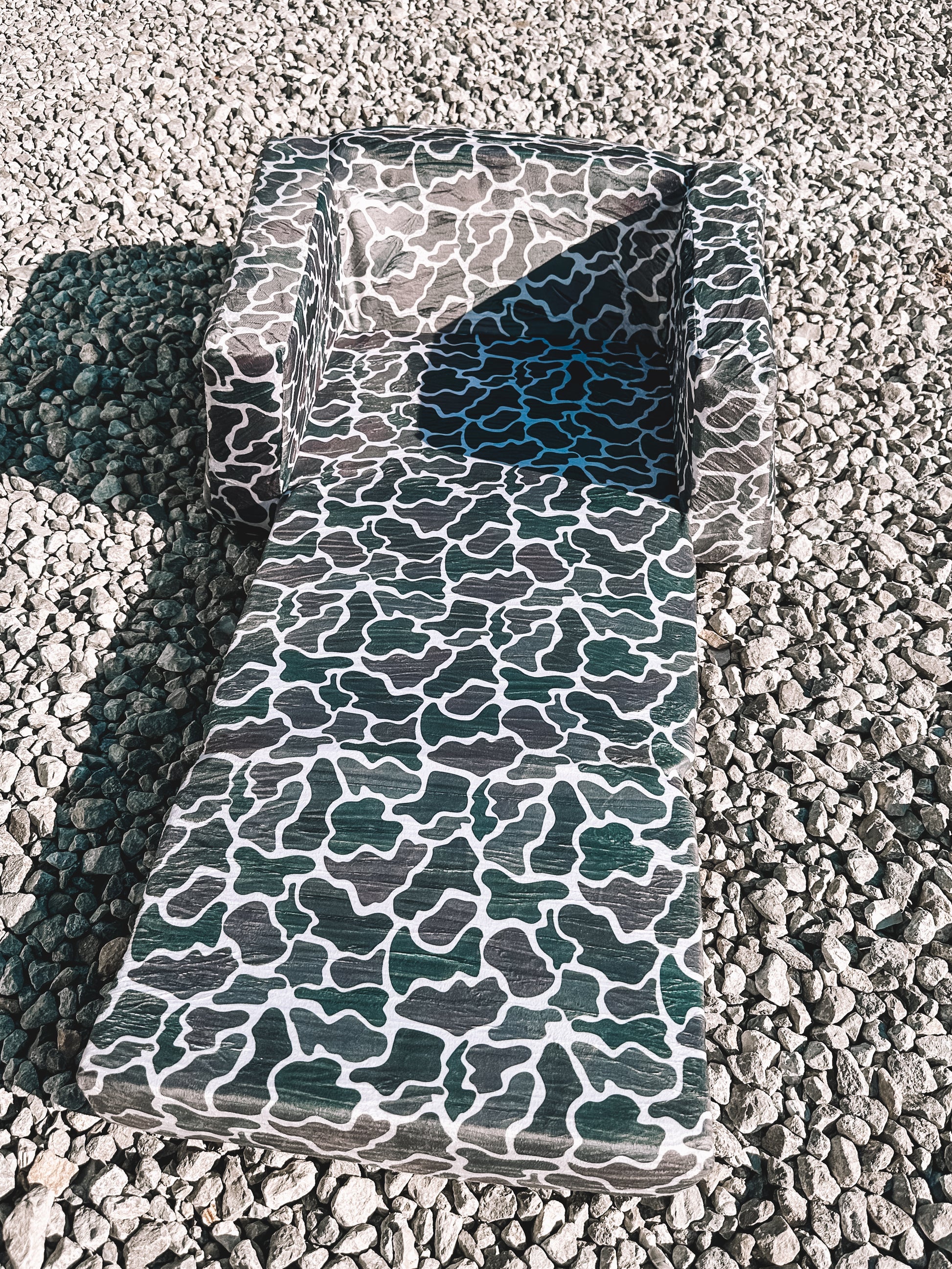 22.5x17x14” folds out into a lounger. Has a pocket on each side. Soft fleece material with removable cover.
