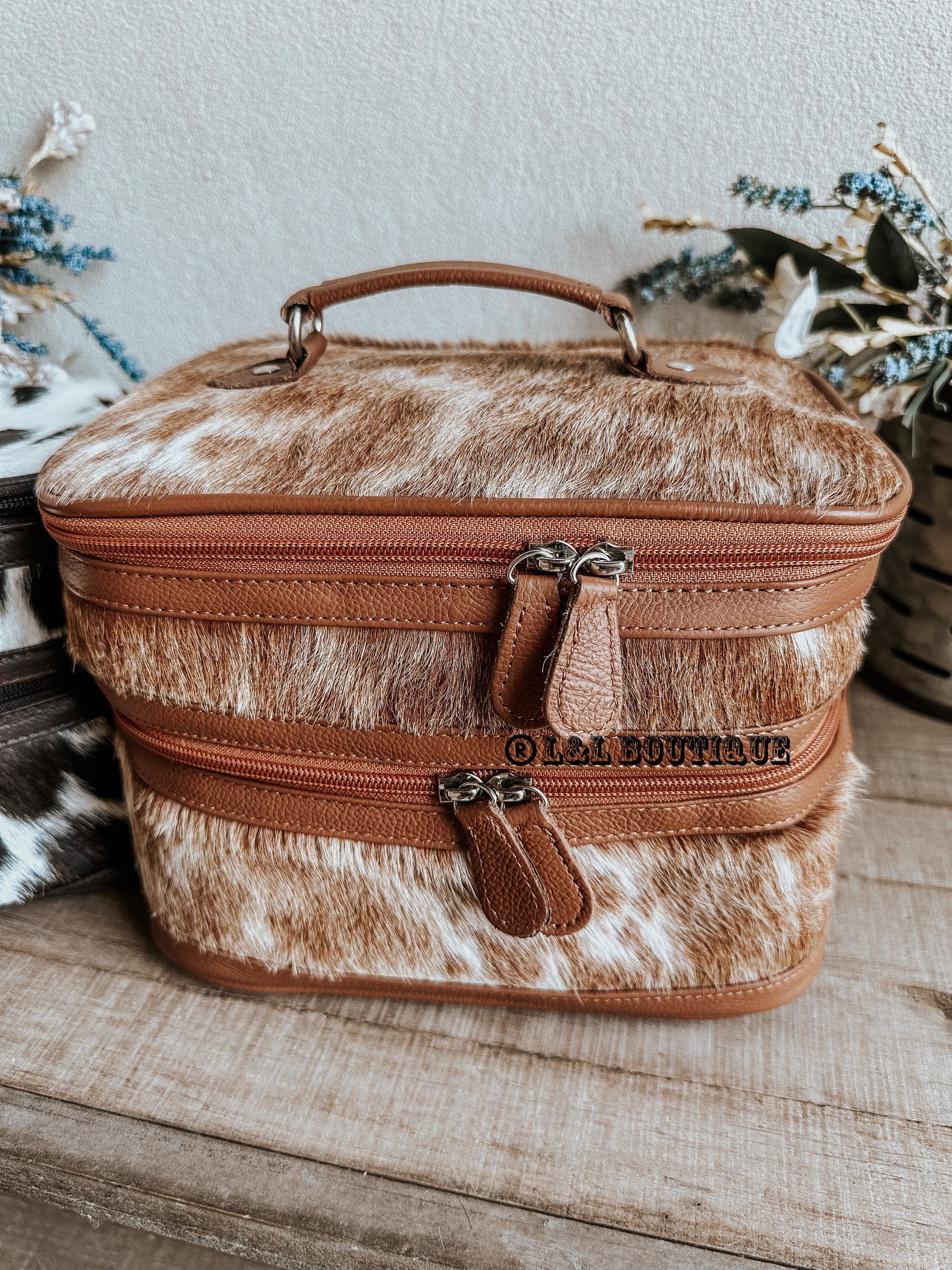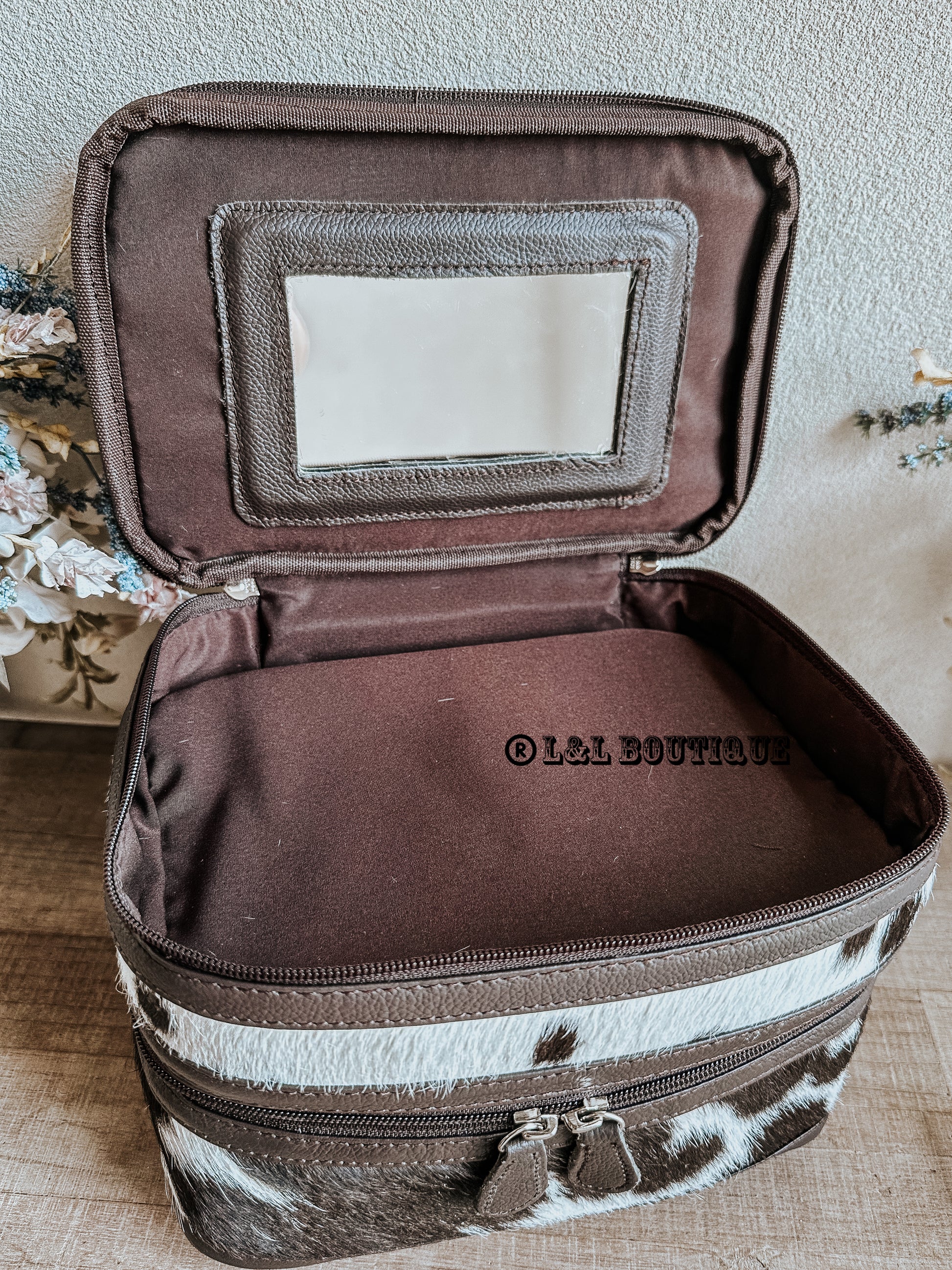 Double compartment, top pocket has a mirror! Lined with canvas material. Sturdy leather handle for carrying.