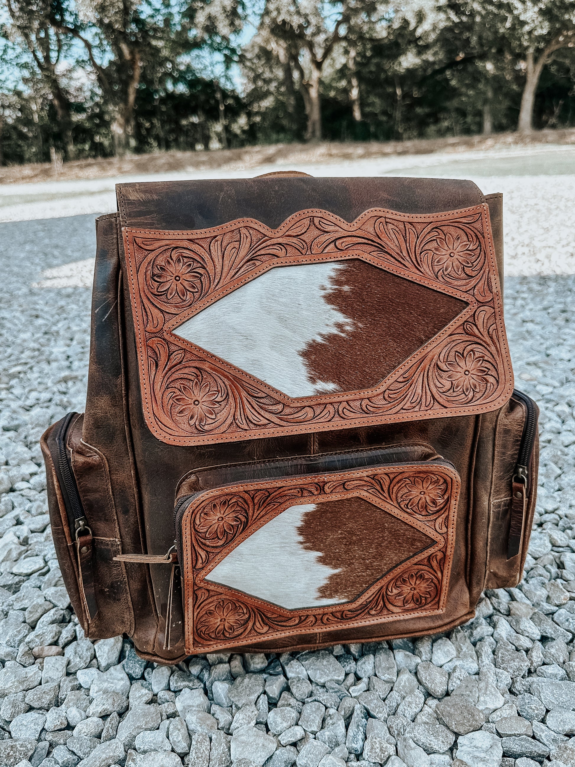 15x13x7” with pockets on the inside and outside. Concealed carry pocket. Adjustable leather straps. Hides vary!