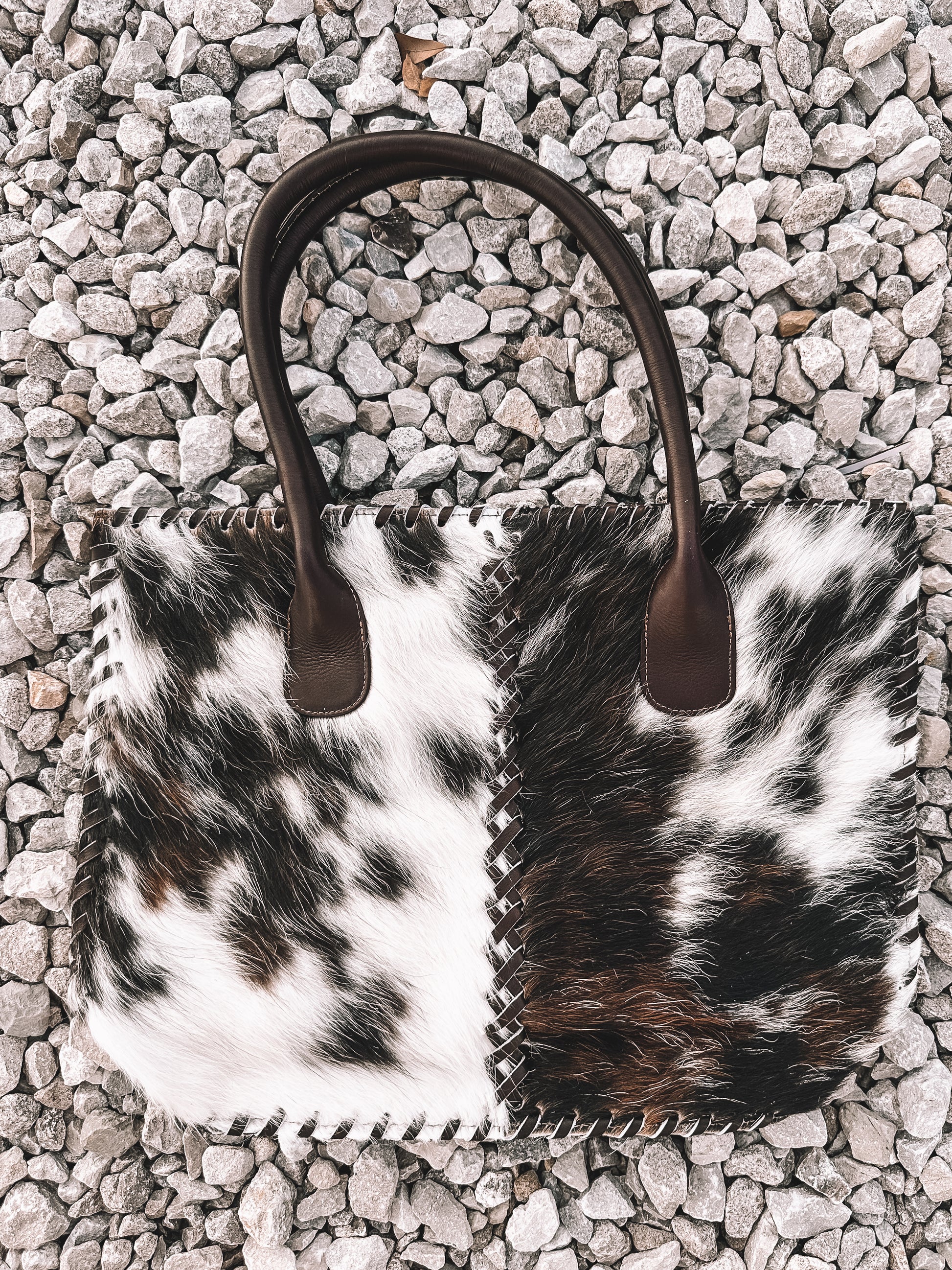14x12x5” with inside pocket. Lined on the inside, completely stitched on outside corners and the base. 2 sturdy leather carrying handles. Hides vary!