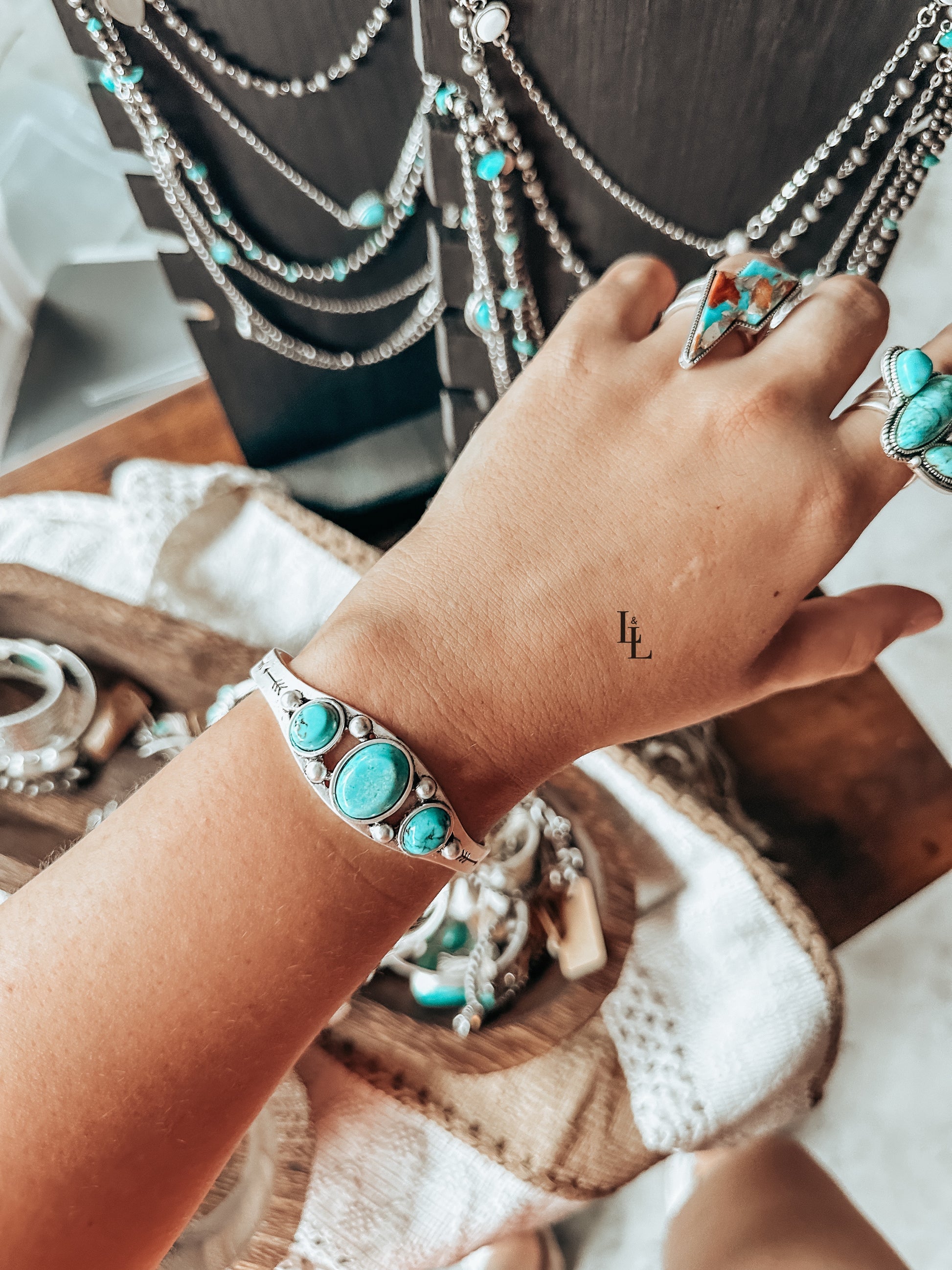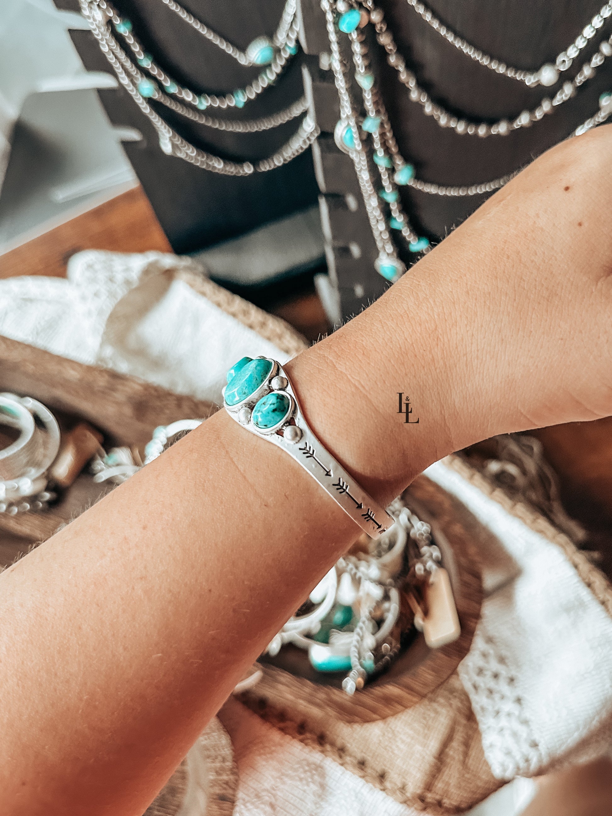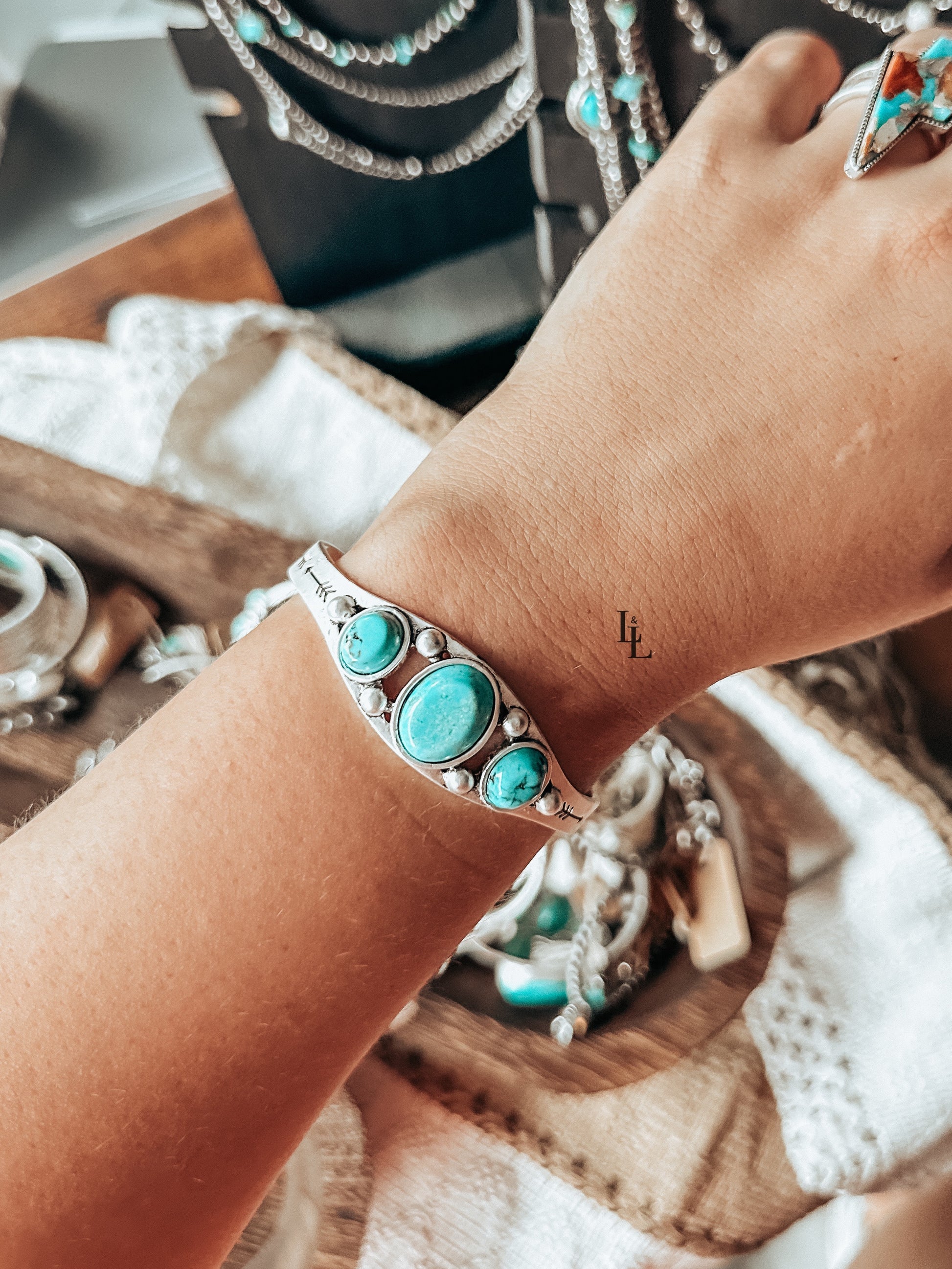 .75” long turquoise at center, alloy metal / nickel + lead free, adjustable cuff style