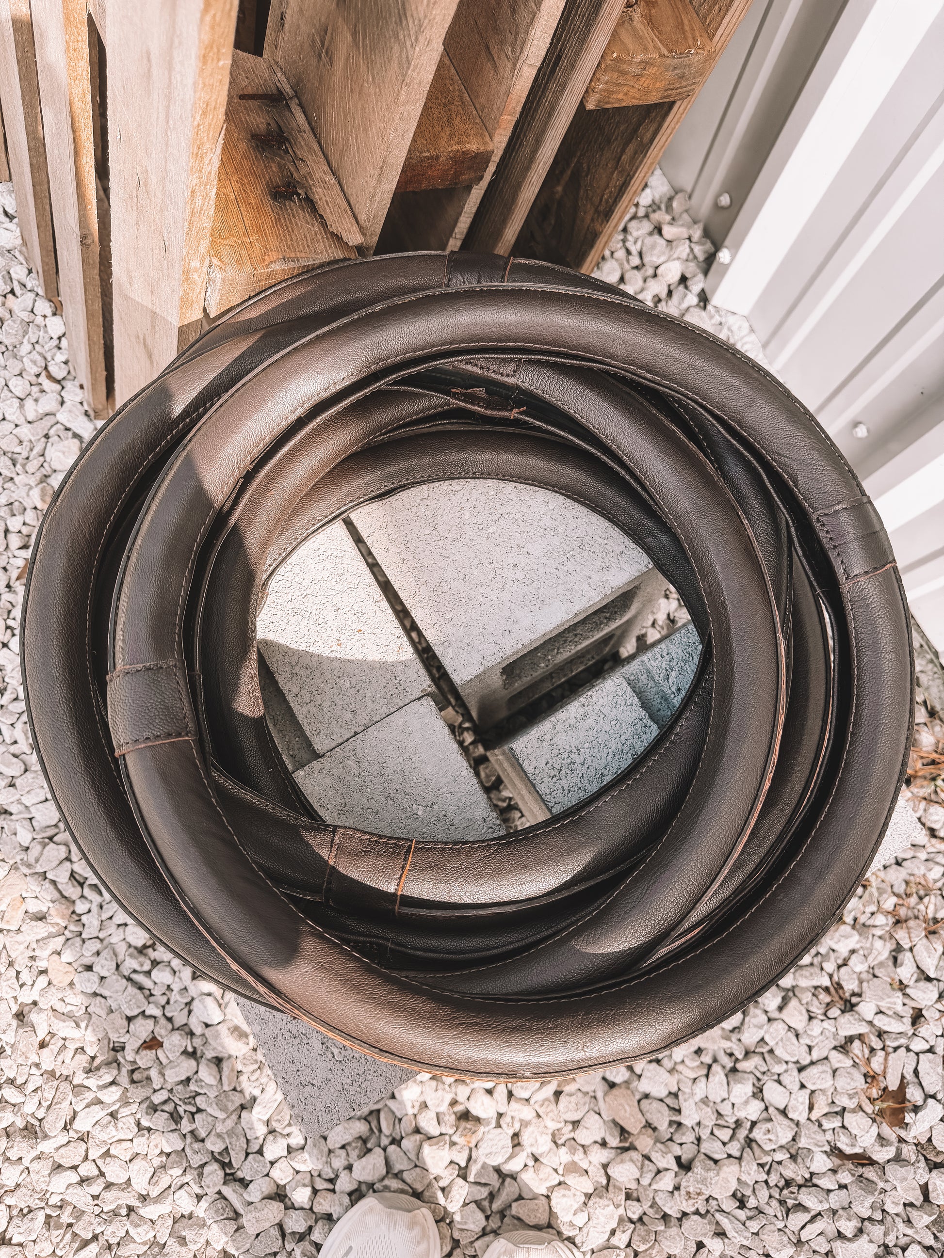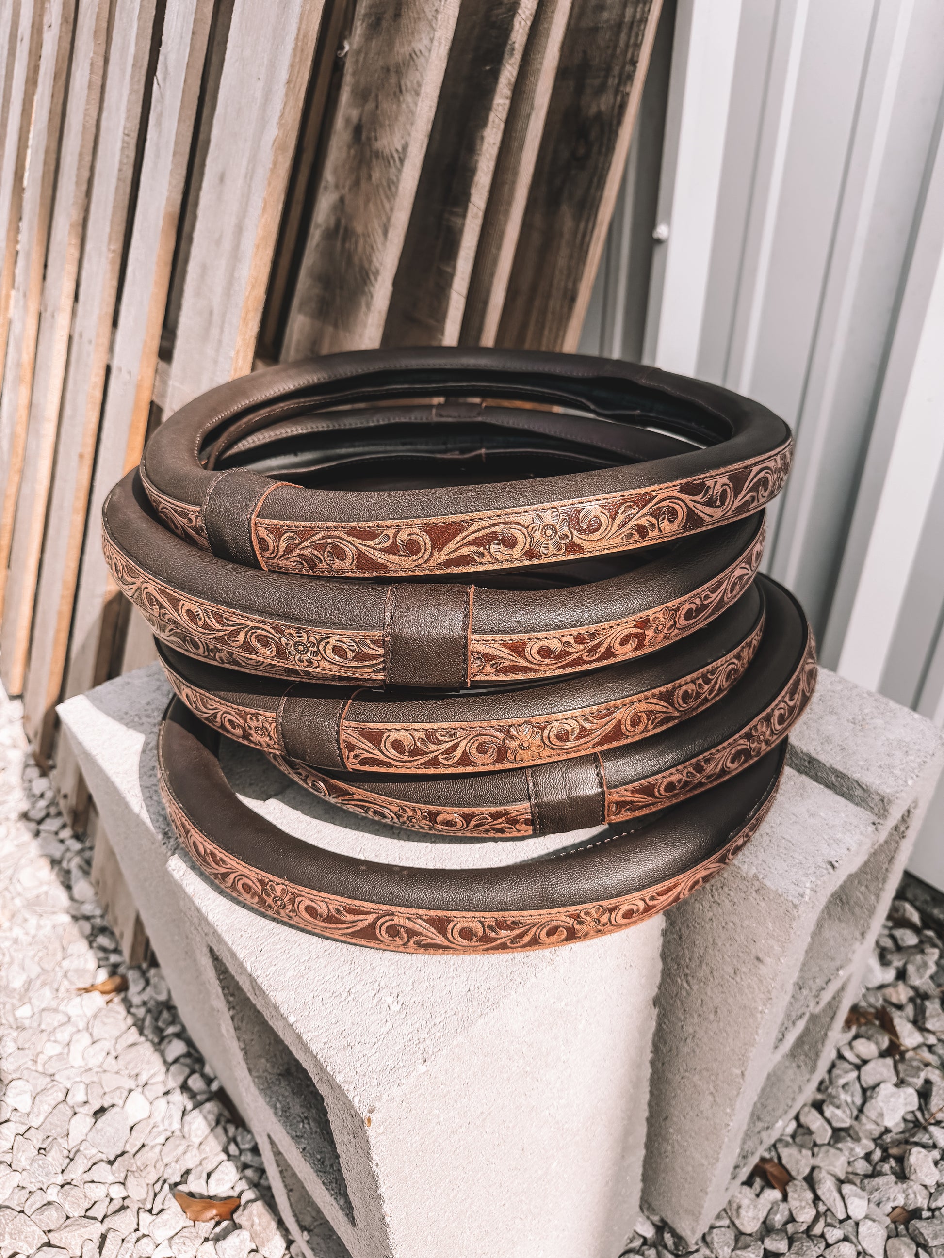 Tooled Leather Steering Wheel Cover in Brown 15 inch