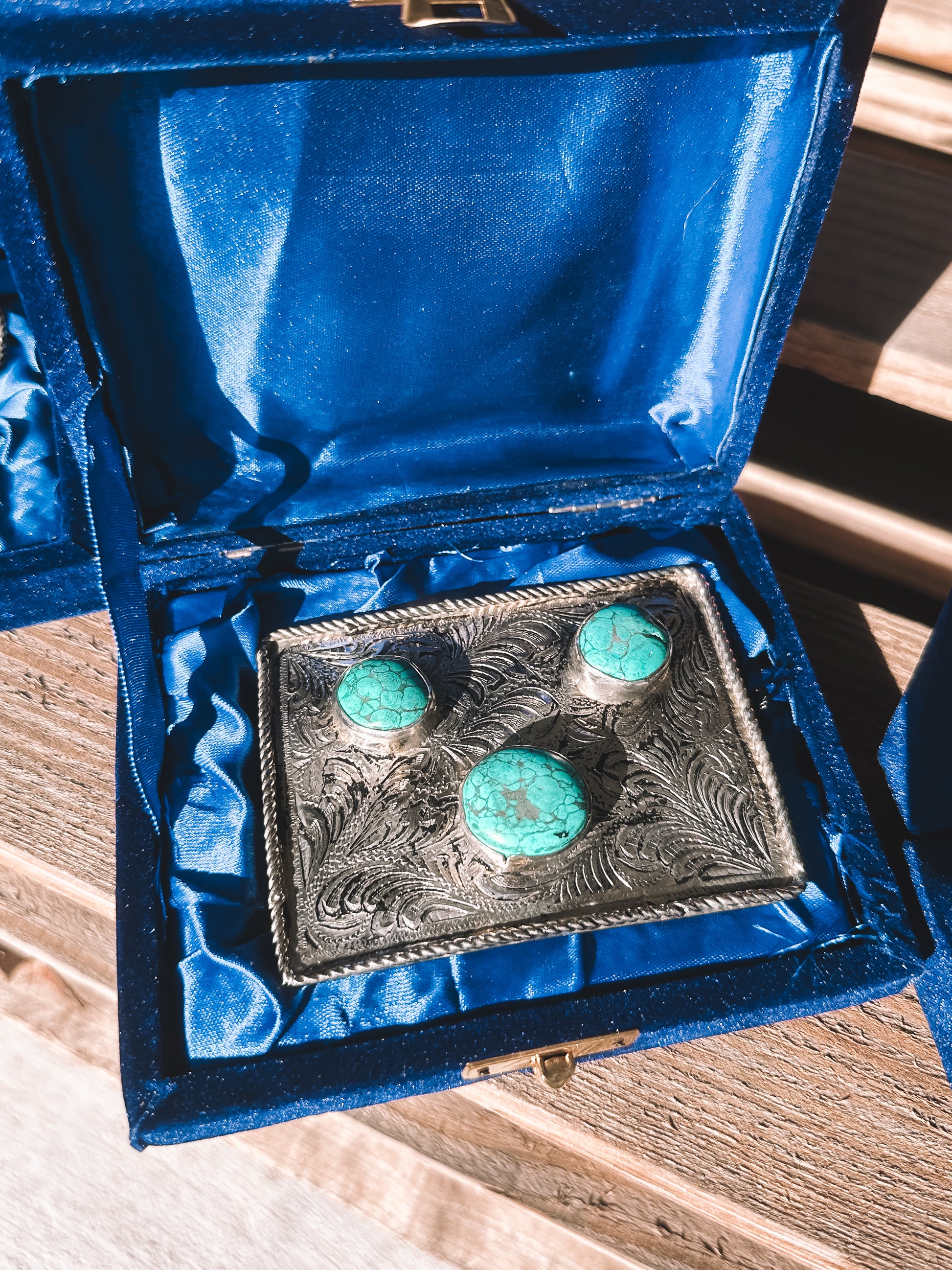 Turquoise & Silver Embossed Belt Buckle - Squared Three Stone