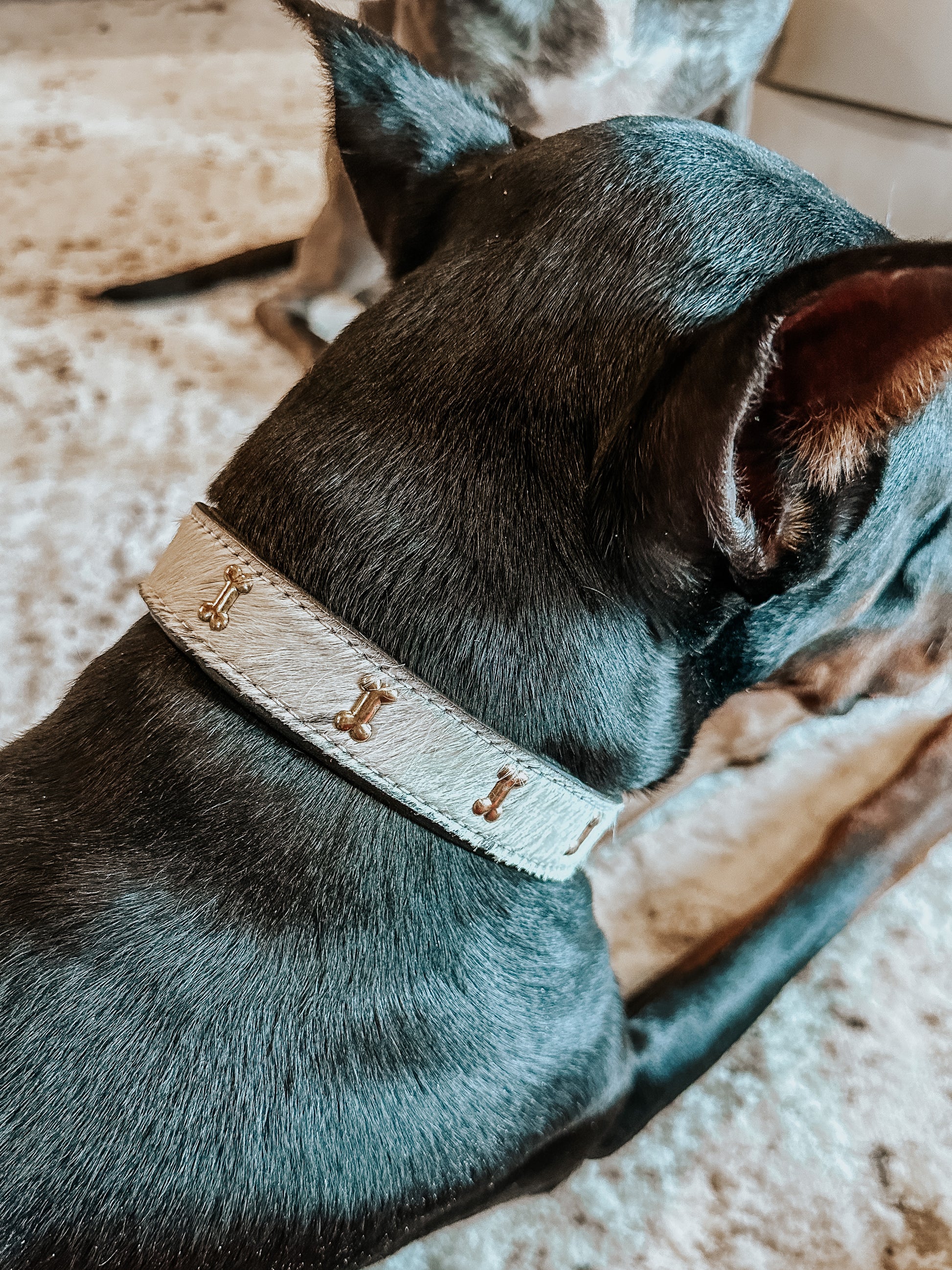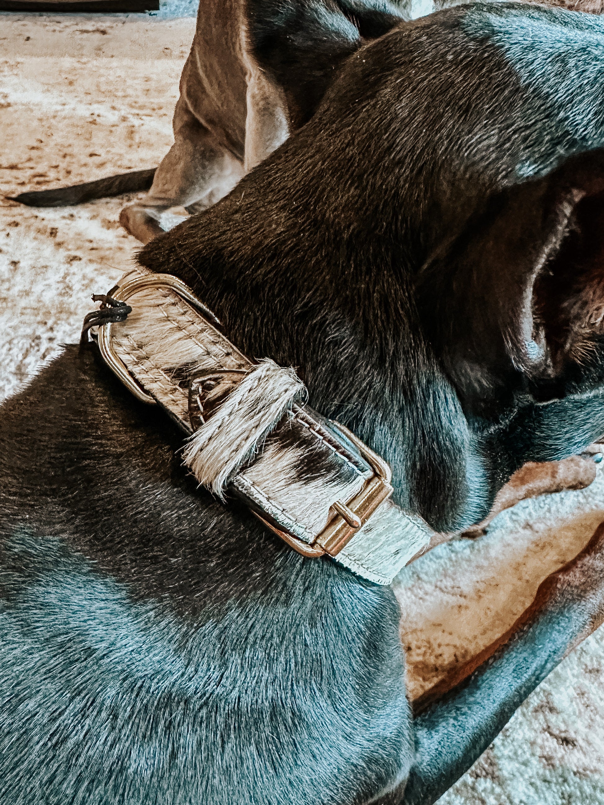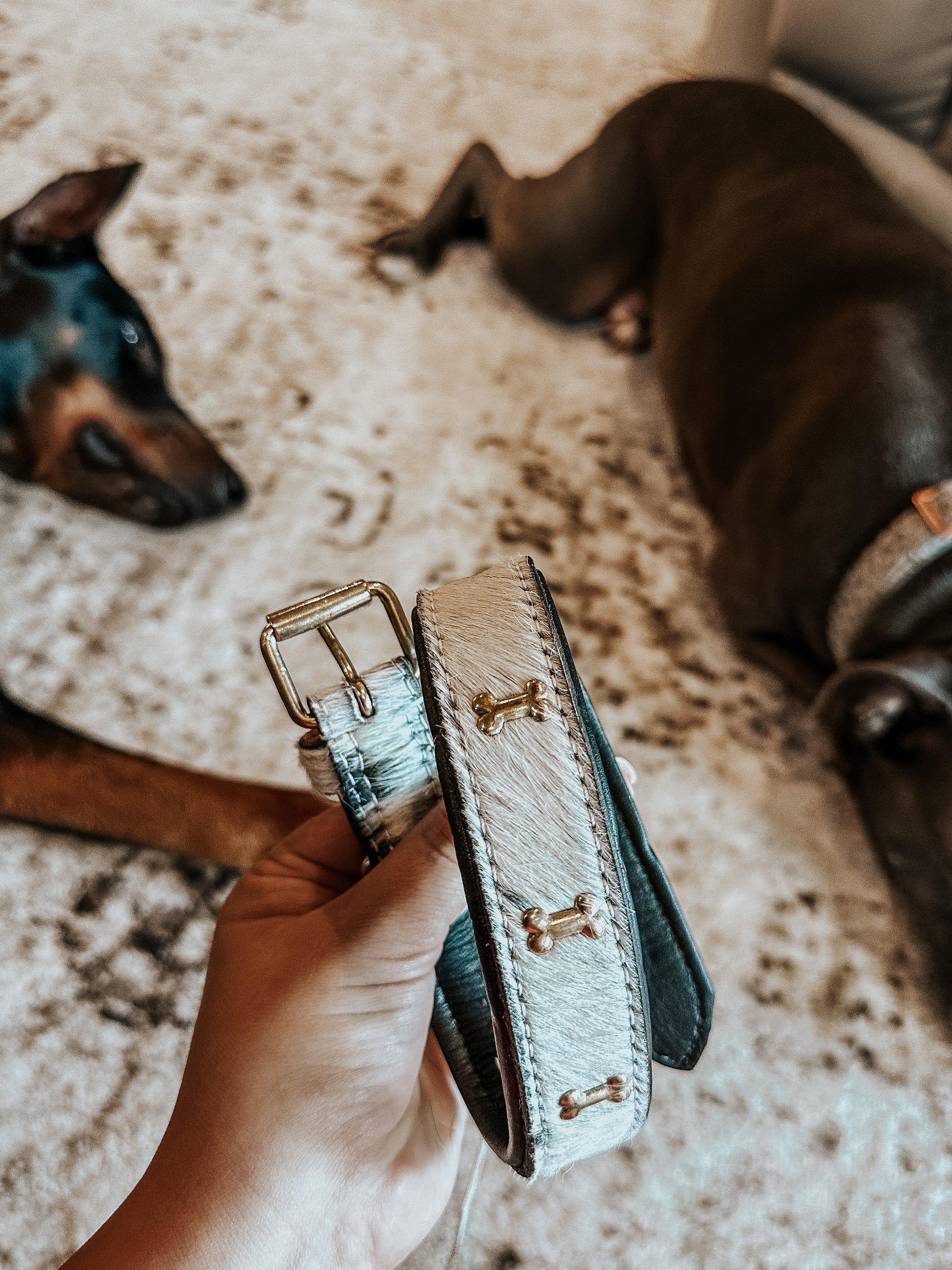Monterey Cowhide Dog Collar with Gold Accent Bones